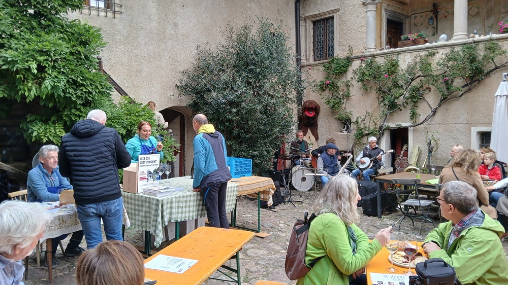 Anlässlich der bereits elften Auflage des Kulturwandertages „Castelmusika“ lud am Sonntag, 19. Oktober erneut der Heimatpflegeverein Eppan Ansitz Kronhof ein. Der malerische Innerhof des Ansitzes unseres Ehrenobmanns Peter v. Hellberg war erfüllt von den Klängen der „Saint Pauls Tschässband“ rund um unser Mitglied Roland Walcher Silbernagele.